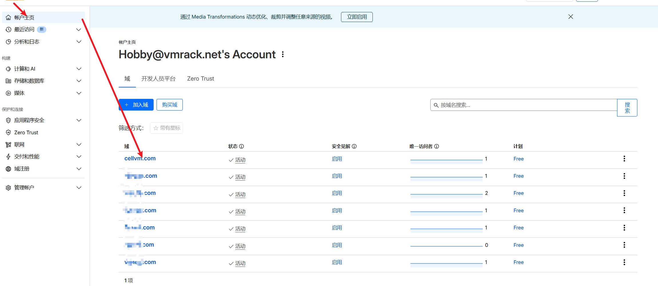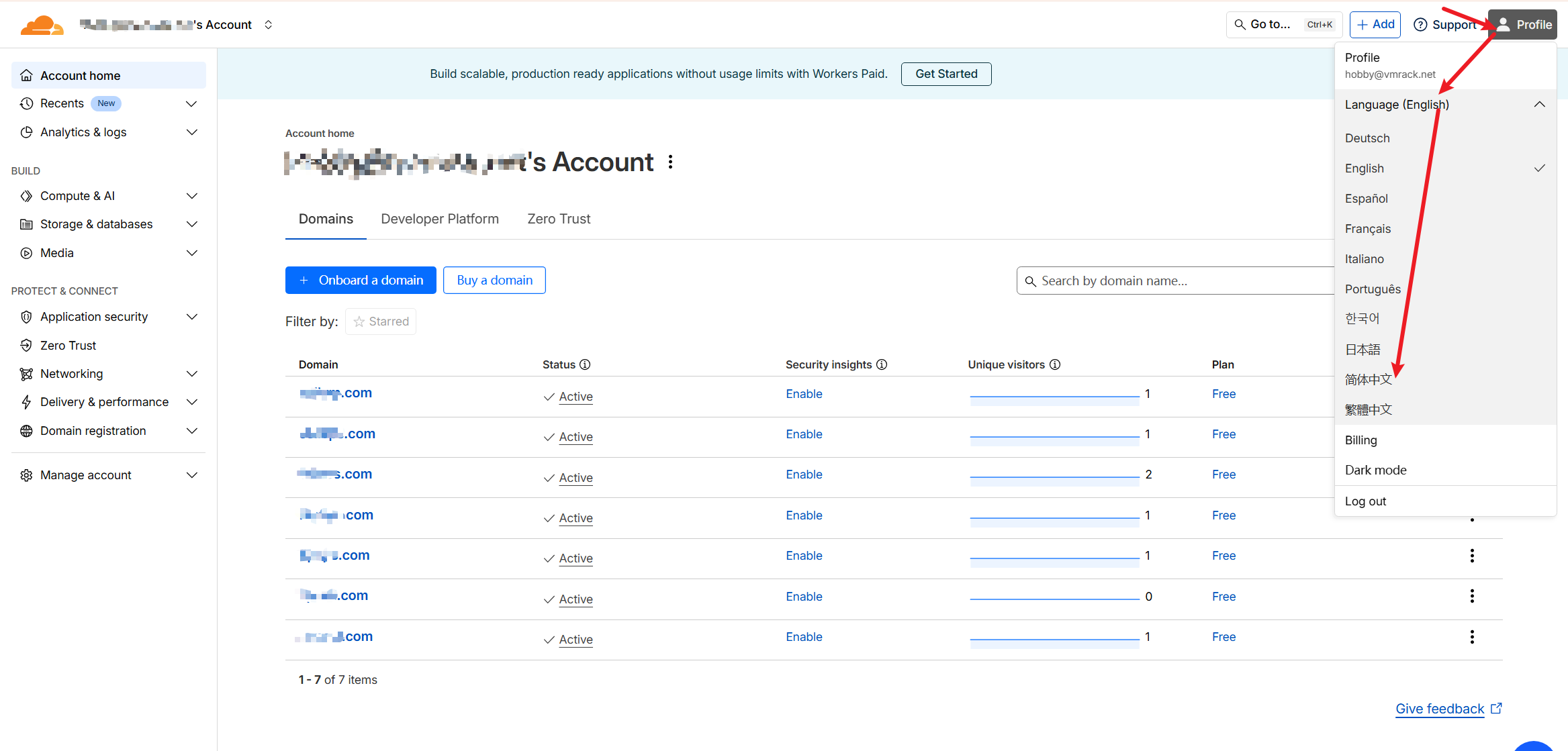 首先进入Cloudflare官网,进入官网自己进行注册和登录后如下图所示,如果显示英语界面可通过以下操作将语言设置为中文。