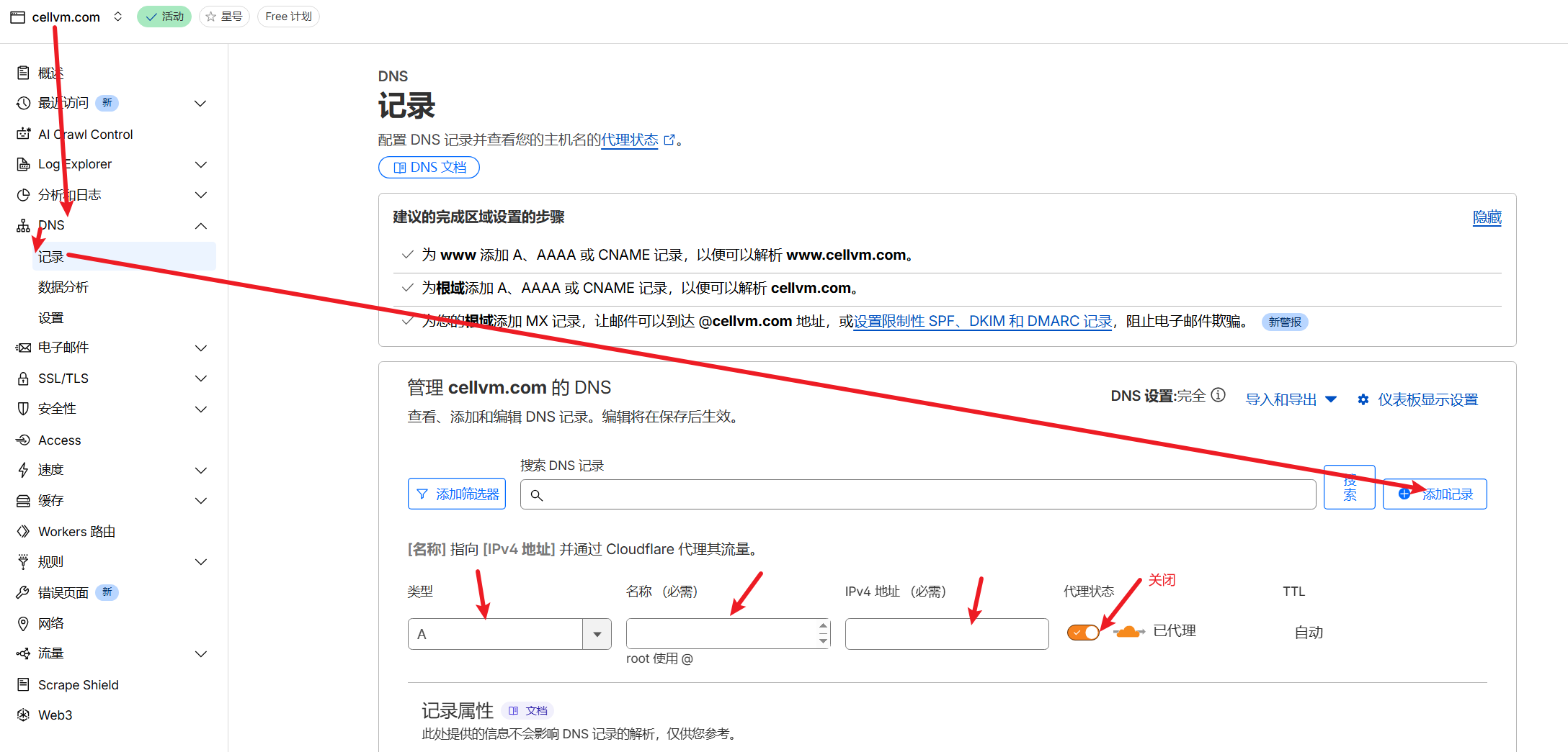 然后点击DNS,点击记录,再点击添加记录,类型选择A,名称这里则是二级域名,这里建议先填@指的是泛域名,IPv4地址则填你服务器的IP地址,代理状态选择关闭,然后再添加纪律,在名称那输入www,其他操作同上,其实名称也能输入其他都行,但例如www作为使用最为广泛的二级域名,还是建议大家使用。