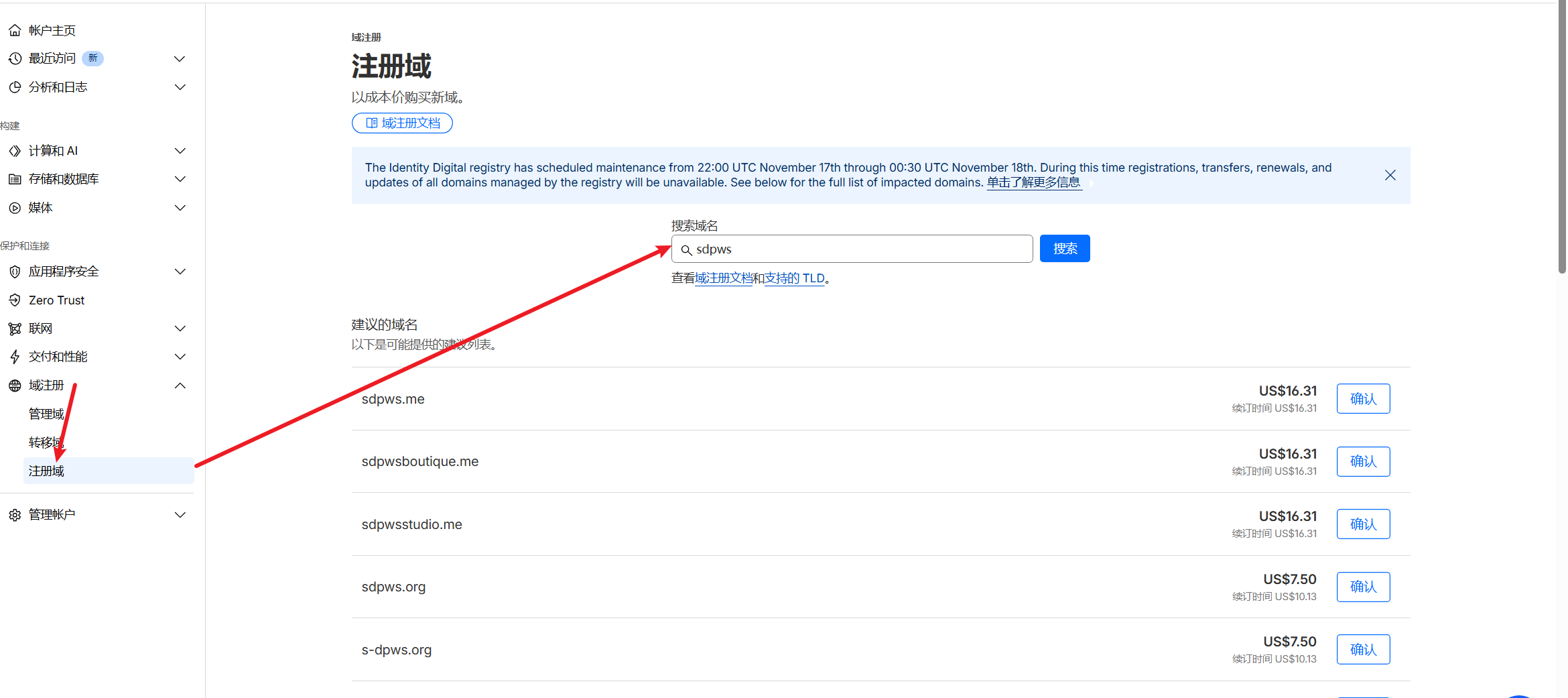 在 Cloudflare 控制台中,进入 “域名注册” 页面,输入你想要的域名名称进行搜索。一般来说简短、常见的域名价格会偏高,普通 .com、.net、.xyz 等后缀中,也有不少价格非常友好的选择。如果只是个人博客或练手站点,完全没必要追求高价域名,选一个便宜、顺眼、好记的即可。我这里的域名已经提前购买完成,具体的购买流程比较简单,基本就是搜索 → 选择 → 支付,这里就不再展开赘述了。